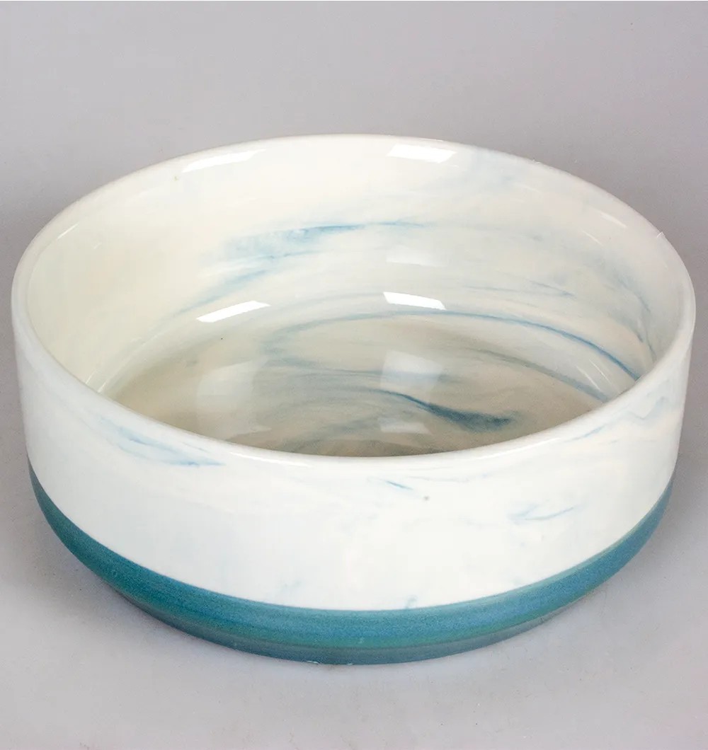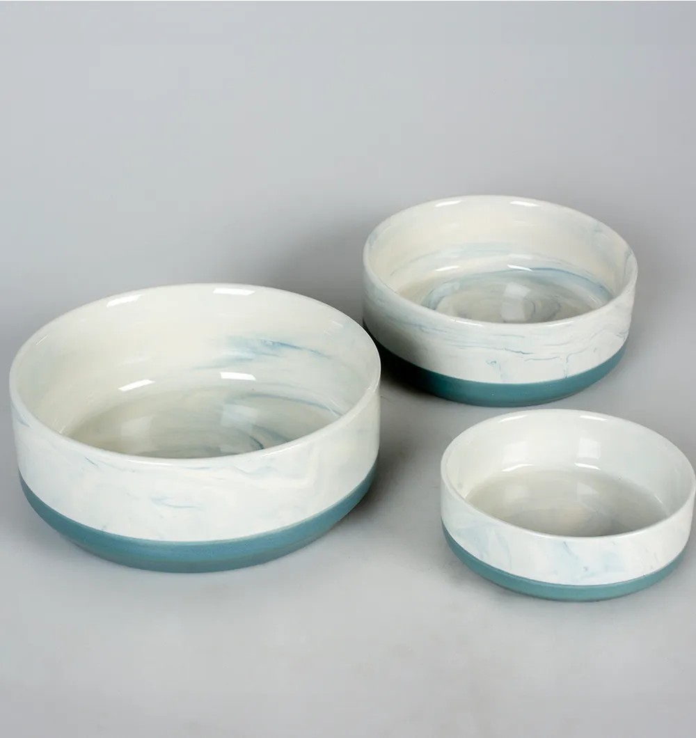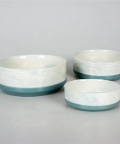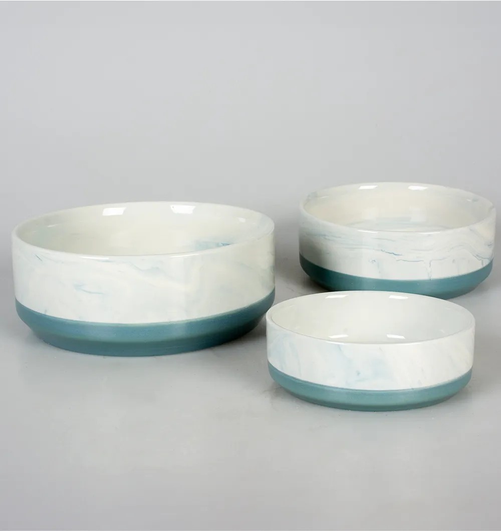 Marmormustriga keraamiline koera ja kassi söögikauss.