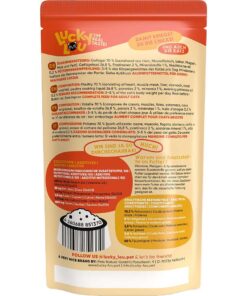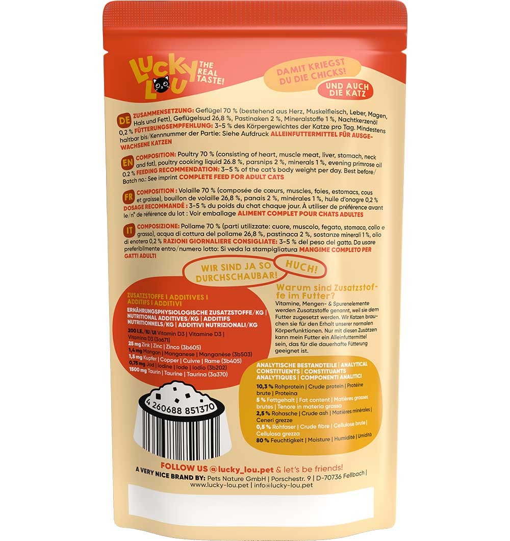 Kodulinnuliha 70% (süda, liha, maks, lihasmagu, kael, rasv), kodulinnu 26,8%, pastinaak 2%, mineraalained 1%, kuningakepiõli 0,2%.