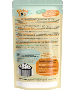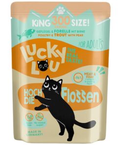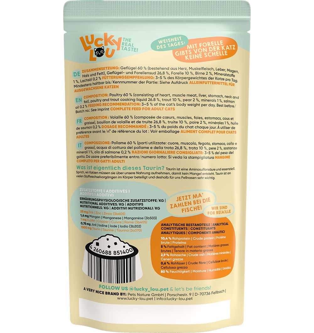 Kodulinnuliha 60% (süda, liha, maks, lihasmagu, kael, rasv), kodulinnu- ja forellipuljong 26,8%, forell 10%, pirn 2%, mineraalained 1%, lõheõli 0,2%.