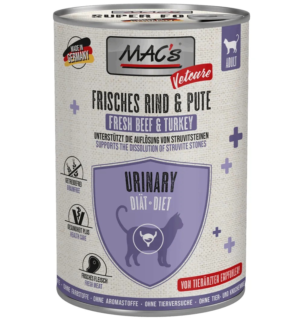 MAC’s Cat Vetcare Urinary konservtoidu vähendatud mineraalainesisaldus alandab mineraalainete kontsentratsiooni uriinis. Metioniini lisamine langetab samuti uriini pH-d ja muudab selle happelisemaks, et vähendada struviitkivide teket.