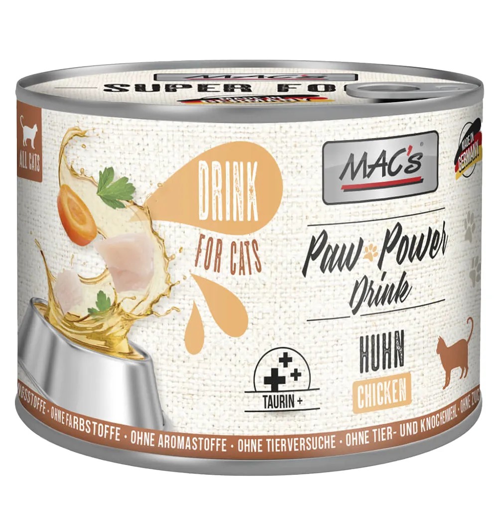 MACs Paw Power Drink joogid kassidele koosnevad toitvast värskest lihast, rohkest vedelikust ja tervislikest köögiviljadest. Need on väga mitmekülgsed ja võimaldavad kasutamist erinevatel viisidel. Näiteks maiusena, ravimite andmise lihtsustamiseks, vedelikuna lisaks joogiveele, kuiv- või konservtoidu täiendamiseks.