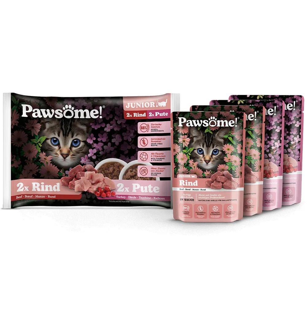 Kassid on karnivoorid, mistõttu Pawsome kassieine konservid sisaldavad rikkalikult liha, on teraviljavabad ja ilma lisatud suhkruta, kuna kumbki neist ei ole kassile loomuomane toiduaine.
