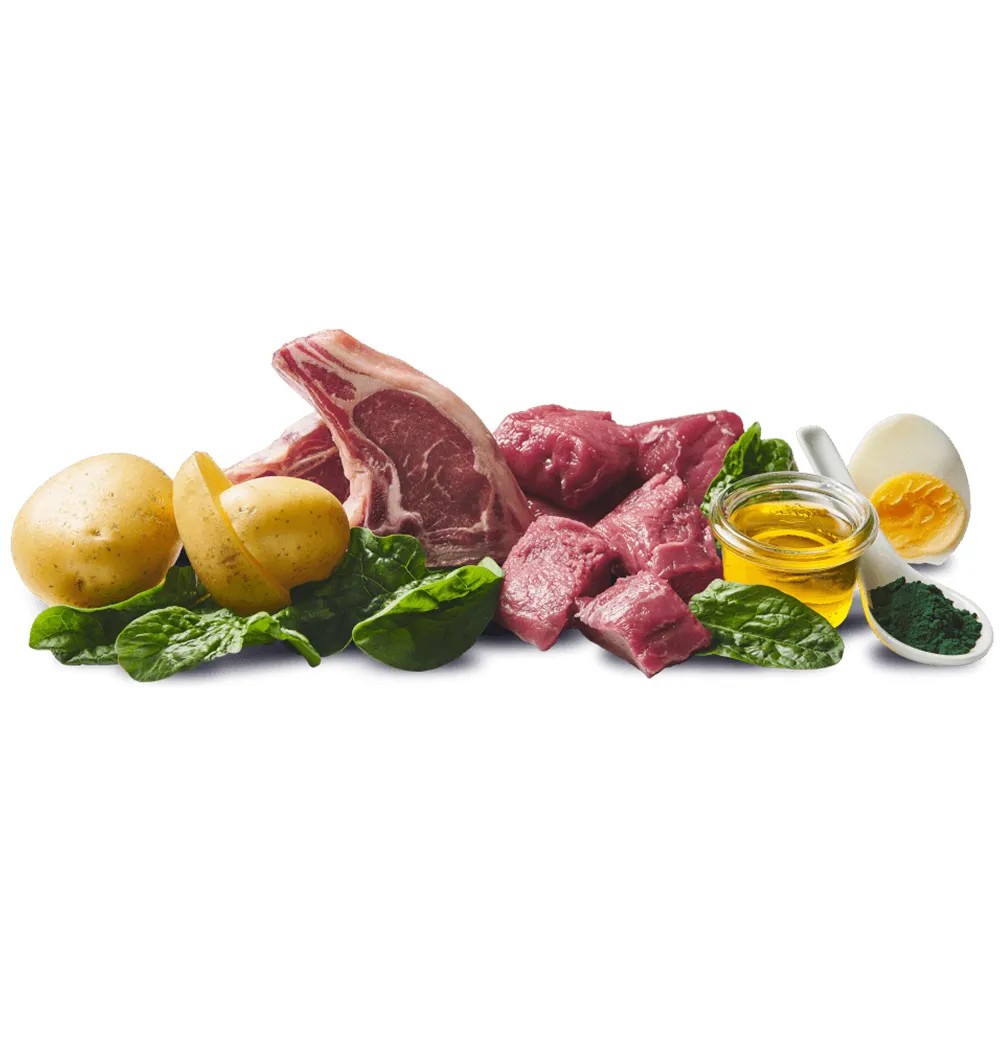 Liha ja siseorganid 60% (50% süda, liha, kopsud, maks; 5% ulukiliha; 5% lambaliha), lihapuljong 28.2%, kartul 5%, spinat 5%, mineraalained 1%, lõheõli 0.4%, täismunad 0.2%, Uus-Meremaa rohekarbid 0.1%, spiruliina 0.1%.