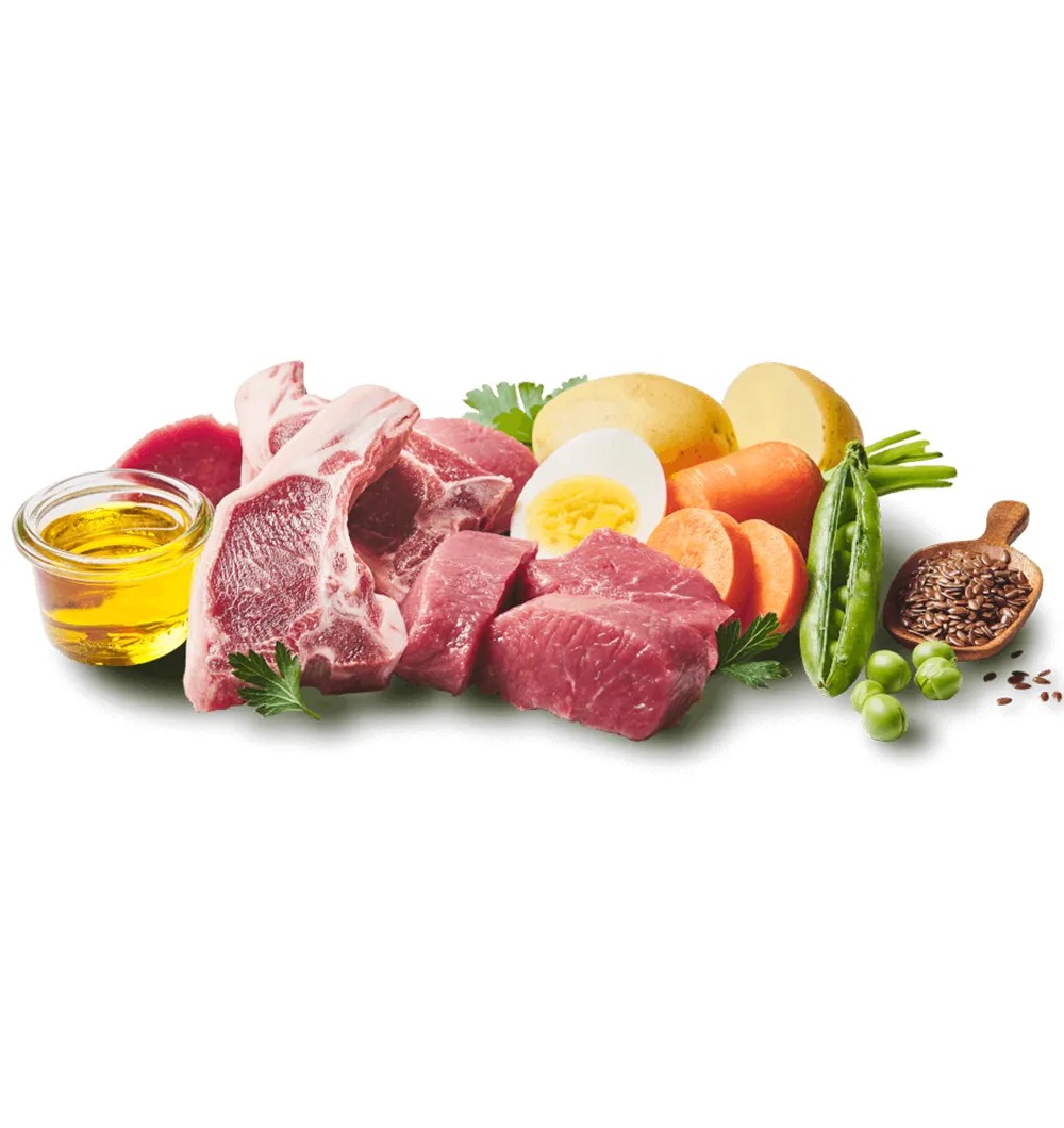 Liha ja siseorganid 70% (60% süda, liha, kopsud, maks; 10% lambaliha), lihapuljong 28.2%, mineraalained 1%, lõheõli 0.4%, täismunad 0.2%, Uus-Meremaa rohekarbid 0.1%, spiruliina 0.1%.