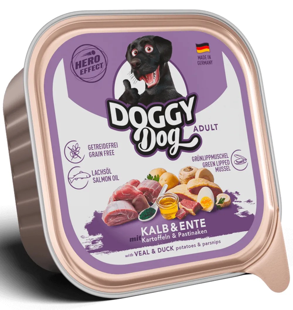 DOGGY Dog koeratoit vasika- ja pardilihaga, koos kartulite ja pastinaagiga, kindlustab sinu neljajalgsele kangelasele täisväärtusliku energiapaketi. Eriti kvaliteetne vasikaliha varustab teda rohke valgu ja väärtusliku raua ning tsingiga.