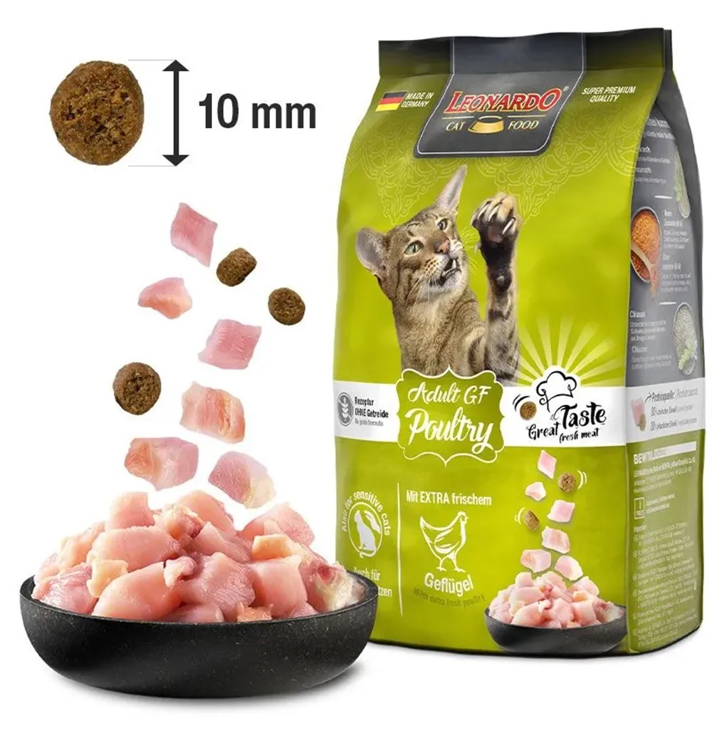 Kassi tasakaalustatud toitumine on väga oluline, seetõttu on LEONARDO toitudes pööratud erilist tähelepanu erinevate koostisosade mitmekülgsusele. Eesmärgiks on võetud, et LEONARDO kuivtoitudes sisalduks vähemalt kaks loomset valguallikat ning et ka taimsete koostisosade sortiment oleks retseptides rikkalikult esindatud, sealhulgas tšiiaseemned, külmpressitud viinamarjaseemne jahu, amarant jm. Need koostisosad tagavad, et Teie kassi toitumine oleks täiuslik, sisaldades kõiki olulisi toitaineid, mis kindlustavad kassi hea tervise, vitaalsuse ja elujõu.