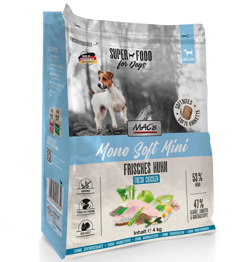 MAC’s “SOFT” sarja toitudel on pehme struktuuriga graanulid, millel on võrreldes hariliku kuivtoiduga kahekordne niiskusesisaldus. Kõik toidud on teraviljavabad ja gluteenivabad. Toidud sisaldavad väga rikkalikult liha ja/või kala, on hõrgutava maitsega, sisaldavad lisavitamiine ning tervislikke rasvu.