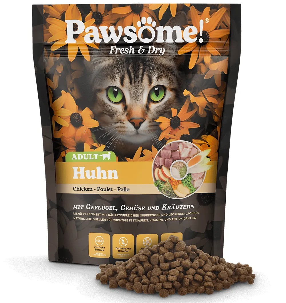 Hellita oma kassi maitsva ja tervisliku einega ning garanteeri rõõmsad nurrumised ja puhas elurõõm – sest ägedad kassid söövad Pawsome!® Fresh & Dry kuivtoitu!