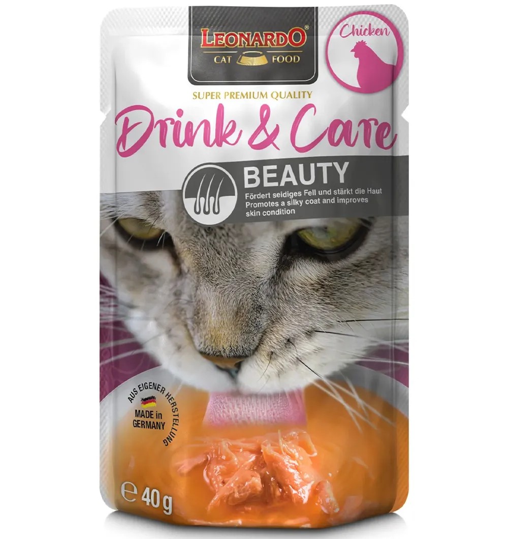 LEONARDO Drink puljong-konserv ahvatleb oma maitse ja lõhna tõttu kassi jooma. Piisav vee tarbimine toetab kassi kuseteede tervist.