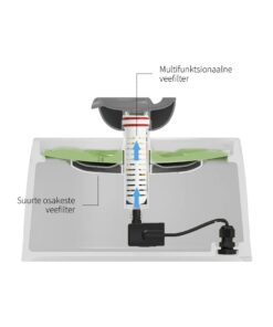 - Suurte osakeste veefiltri kolmekordne filtreerimissüsteem filtreerib välja karvad, tolmu ja prahi; eemaldab lõhnad ja mittesoovitavad ained; pehmendab kraanivett.