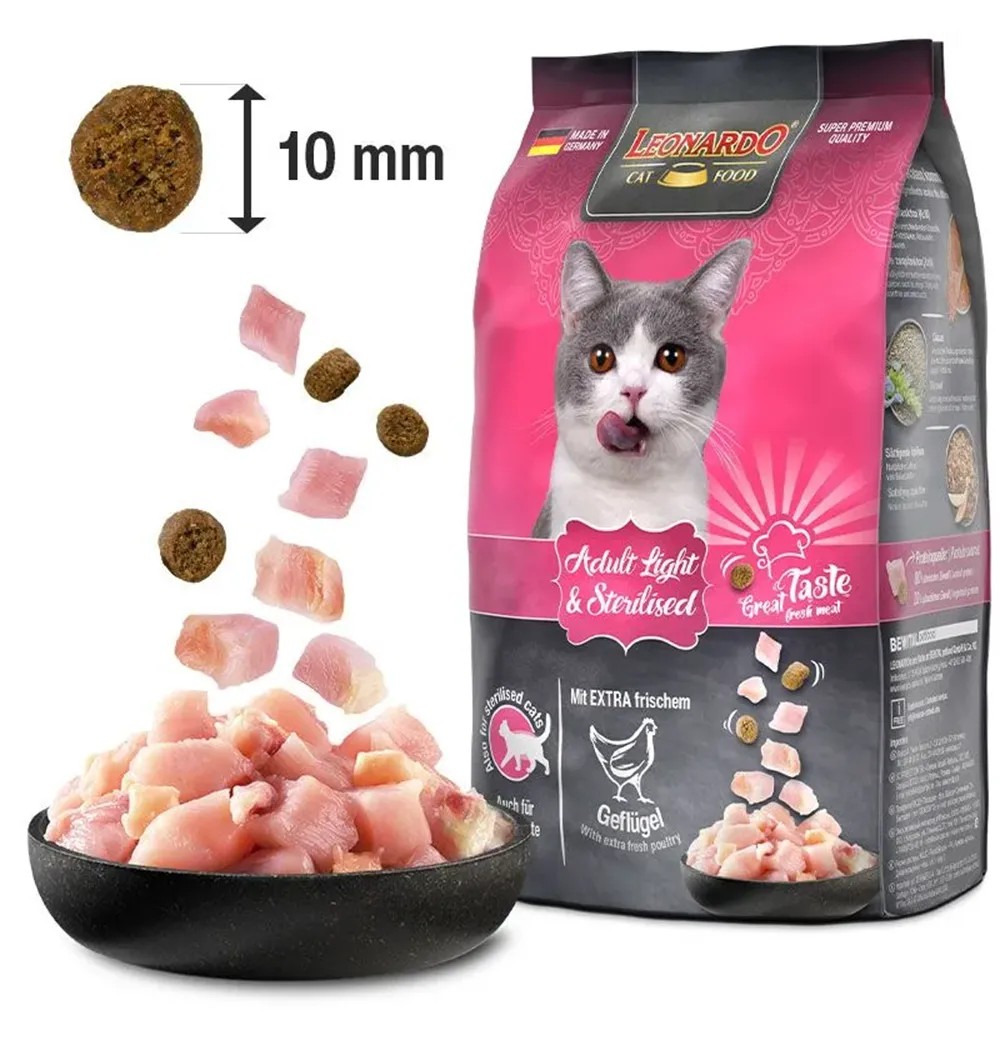Kassi tasakaalustatud toitumine on väga oluline, seetõttu on LEONARDO toitudes pööratud erilist tähelepanu erinevate koostisosade mitmekülgsusele. Eesmärgiks on võetud, et LEONARDO kuivtoitudes sisalduks vähemalt kaks loomset valguallikat ning et ka taimsete koostisosade sortiment oleks retseptides rikkalikult esindatud, sealhulgas tšiiaseemned, külmpressitud viinamarjaseemne jahu, amarant jm. Need koostisosad tagavad, et Teie kassi toitumine oleks täiuslik, sisaldades kõiki olulisi toitaineid, mis kindlustavad kassi hea tervise, vitaalsuse ja elujõu.